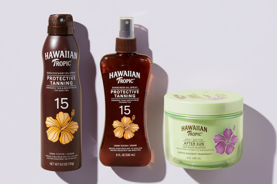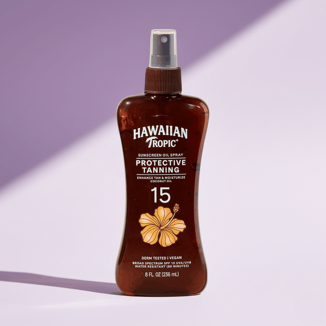 The Hawaiian Tropic Dry Oil Tanning Spray Sunscreen is our MVP here. It gives you that necessary UVA/UVB protection while the dry oil formula starts the moisturizing process immediately.